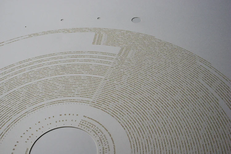 The resulting poster was the catalyst for a chain reaction which brought him back towards the scientific roots he’d been so keen to abandon. Crnokrak’s subsequent visualisations have interpreted data relating to everything from quantum physics to geopolitics, marrying immensely complex sets of information with a sensitive, minimalist design sensibility to stunning effect. Both the research and the actual creation of these posters can be immensely time-consuming for Crnokrak, with the recently completed visualisation Everyone Ever in the World taking three months just to collect the data. The finished poster is a visual comparison between the total number of people who have ever lived and the number killed in conflicts since records began. “The data collection for that one was both disarmingly simple and cripplingly difficult,” he recalls. “I hesitated to start it because I knew how much work would be involved. Also, I wondered whether anyone would actually be interested—or whether it was just obsessive ‘design wanking’.”